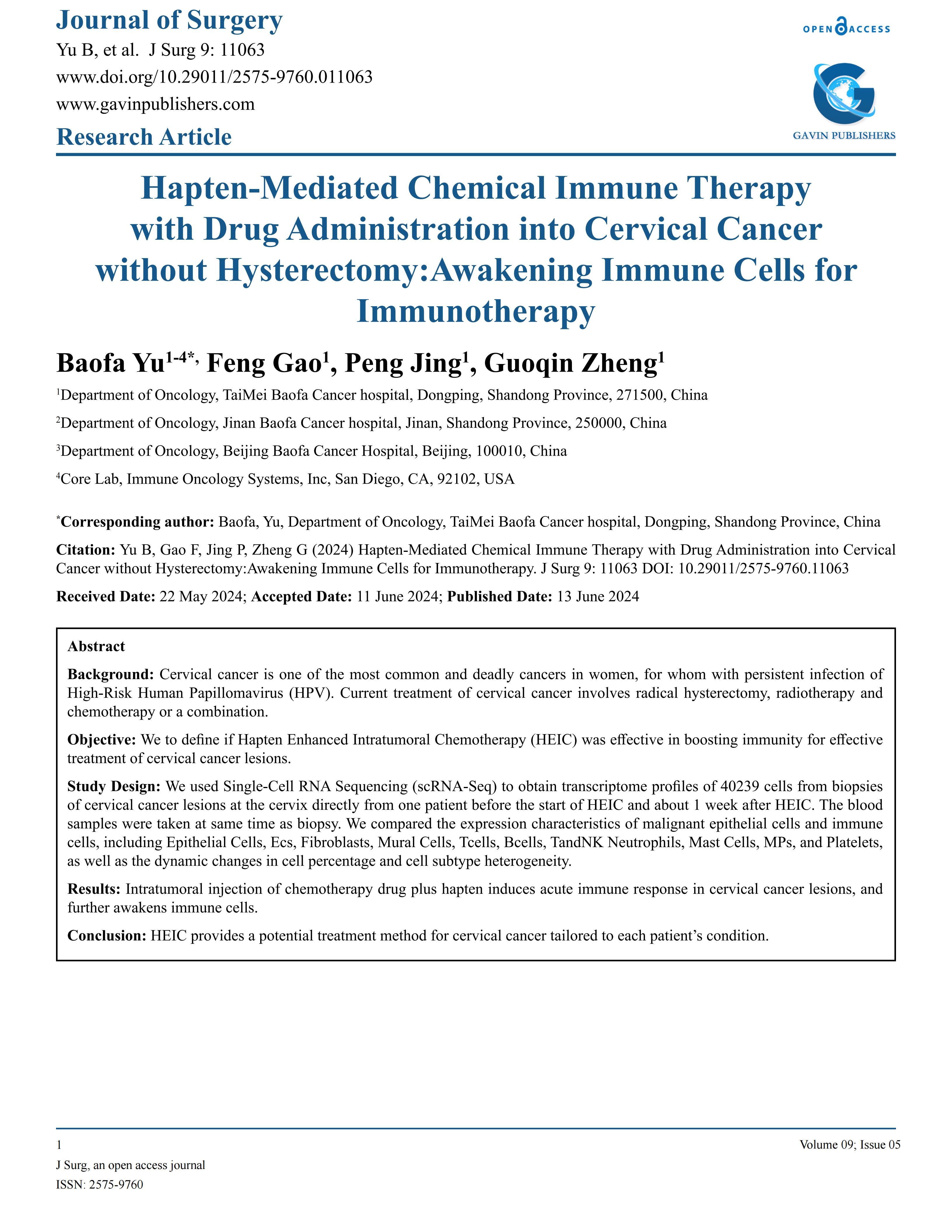 A landmark advancement has been achieved in the field of gynecological oncology at our institute. The latest scientific research paper by Academician BaofaYu, President of Shandong Baofa Tumor Research Institute and Foreign Academician of the Russian Academy of Natural Sciences, and his team, titled "Hapten-Mediated Chemical Immune Therapy with Drug Administration into Cervical Cancer without Hysterectomy: Awakening Immune Cells for Immunotherapy," has been officially published in a renowned international surgical journal.